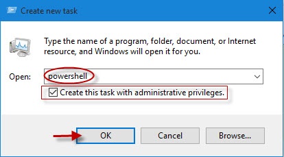 Step 3: Type powershell > mark box for Create this task with admin rights > OK.