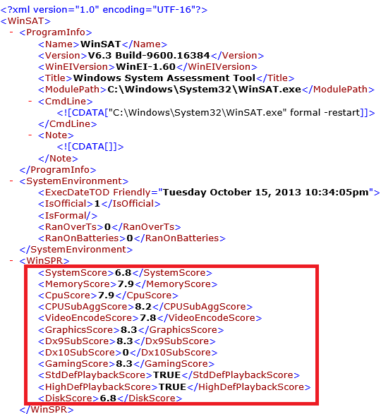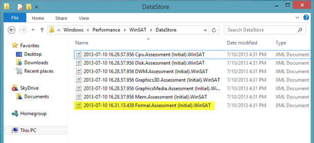 As we mentioned above, WEI isn’t visible in Windows 10 as it runs the benchmark automatically and scores saved in a local file in %WINDIR%\Performance\WinSAT\DataStore folder.