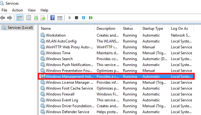 In Services window, Scroll down and Find Windows Management Instrumentation.