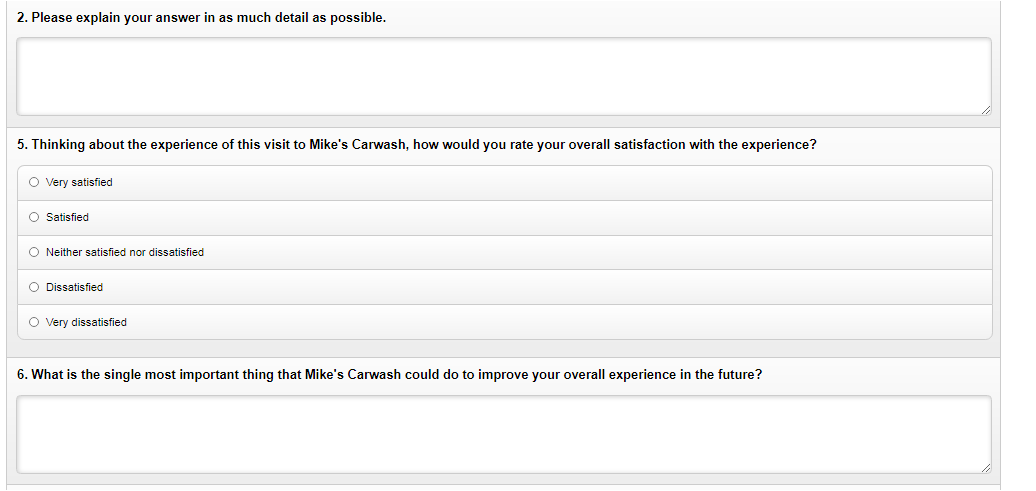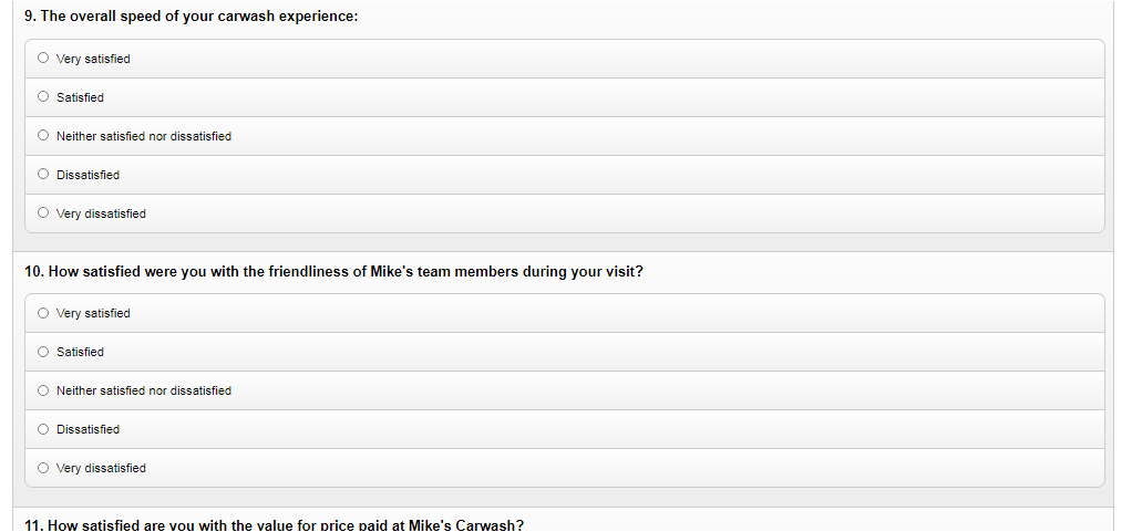 - Thinking about the experience of this visit to Mike’s Carwash, how would you rate your overall satisfaction with the experience?.