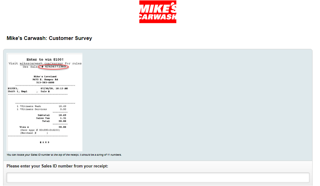 - Please enter Mike’s Carwash Sales ID number from your receipt.